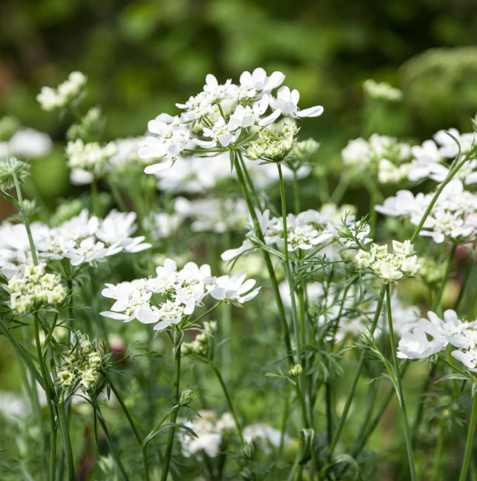 На наш взгляд, орлайя — лучший белый кружевной цветок, образующий множество изящных, танцующих зонтиковидных соцветий из чисто-белых цветов. Внешние лепестки каждого зонтика похожи на крошечные сердечки, которые порхают, словно самые лёгкие бабочки, на краю отдельных цветков. Это компенсирует все хлопоты с данным растением и несмотря на то, что он однолетник, мы решили его выращивать и предлагать в нашем питомнике. Длительное цветение с июня по октябрь прекрасно сочетается с другими цветами и делает это растение идеальными "наполнителем" цветника, особенно на первый год посадки.